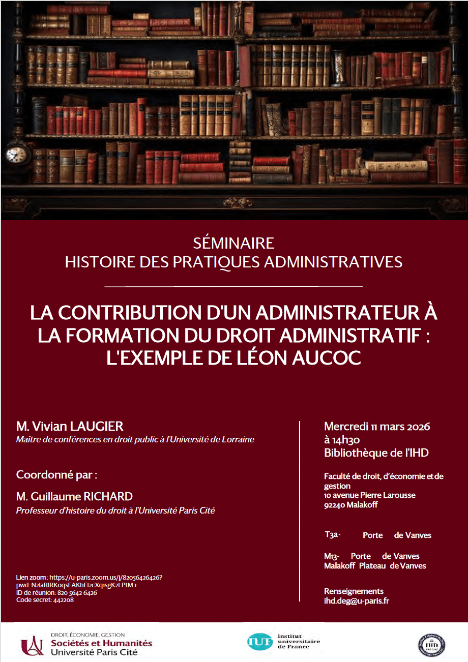 L’Institut d’histoire du droit organise un séminaire le mercredi 11 mars 2026 à 14h30, à la Bibliothèque de l’IHD (Faculté de droit, d’économie et de gestion, 10 avenue Pierre Larousse, 92240 Malakoff), dans le cadre du cycle « Histoire des pratiques administratives », coordonné par Monsieur le Professeur Guillaume Richard.